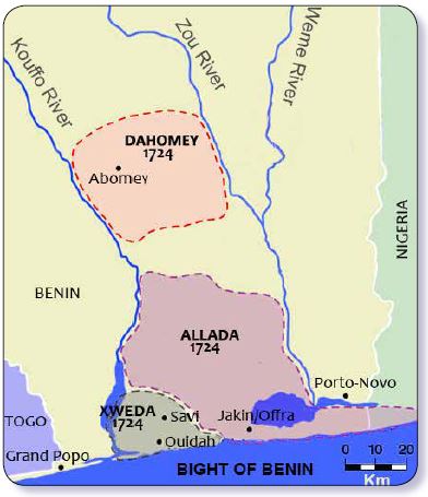 Le royaume du Dahomey, solidement organisé autour de son roi Houegbadja, entreprend de contrôler les clans environnants à partir de la forteresse d’Agbomé (royaume d’Abomey). Houegbadja fit d’Abomey un État puissant puis, Akaba (1685-1708) et Agadja (1708-1740) lui succédèrent. Désireux d’avoir accès aux routes commerciales menant aux côtes du Golfe de Guinée, Le roi Agadja réalisa l’expansion la plus significative de l’empire.