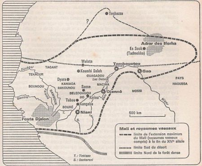 Jamais l’empire ne fut aussi étendu, de l’Océan Atlantique à l’Est de la boucle du Niger, et de la zone forestière au sud, aux salines de Teghazza au nord. Il englobait ainsi les actuels Etats du Mali, du Sénégal, de la Gambie, de la Guinée Conakry, de la Guinée Bissau, de la Mauritanie et une partie du nord la Côte d’Ivoire.