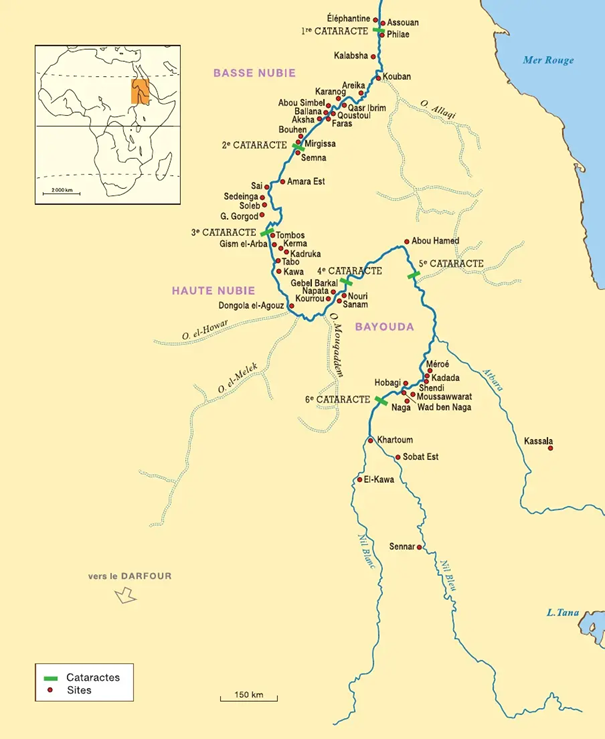 Cette région appelée Nubie qui fut à la fois l’ancêtre et la rivale de l’Égypte était située au sud de l’Empire égyptien, couvrant l’actuel Soudan et le sud de l’Égypte contemporaine jusqu’à la frontière éthiopienne. La Nubie fut particulièrement prospère au Ve millénaire av J.C ; surpassant son voisin, ce dernier comblera ce retard un millénaire plus tard avec le développement des sociétés du Prédynastique.