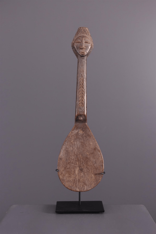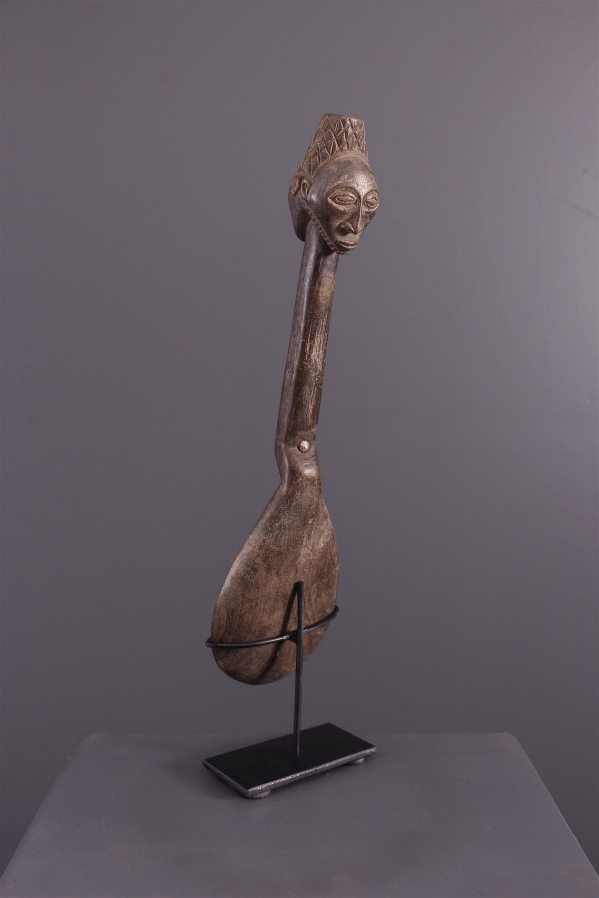 Dans la société Luba, le corps des femmes est considéré comme le réceptacle ultime du pouvoir spirituel et les préceptes de la royauté divine sur lesquels s’appuient les dirigeants Luba. Par conséquent, les représentations de la forme féminine sont représentées dans le cadre d’une riche variété d’insignes de leadership Luba. La figure au sommet du bâton représente l’esprit du roi logé dans le corps féminin. Ses bras croisés attirent l’attention sur ses seins, qui contiennent les principes de la royauté divine, tandis que sa peau superbement décorée et sa coiffure élaborée suggèrent la réussite sociale.